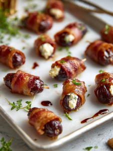 - Drizzle the dates with balsamic glaze and sprinkle with chopped herbs if using. The glaze adds a bright, tangy contrast to the rich, crispy bites.