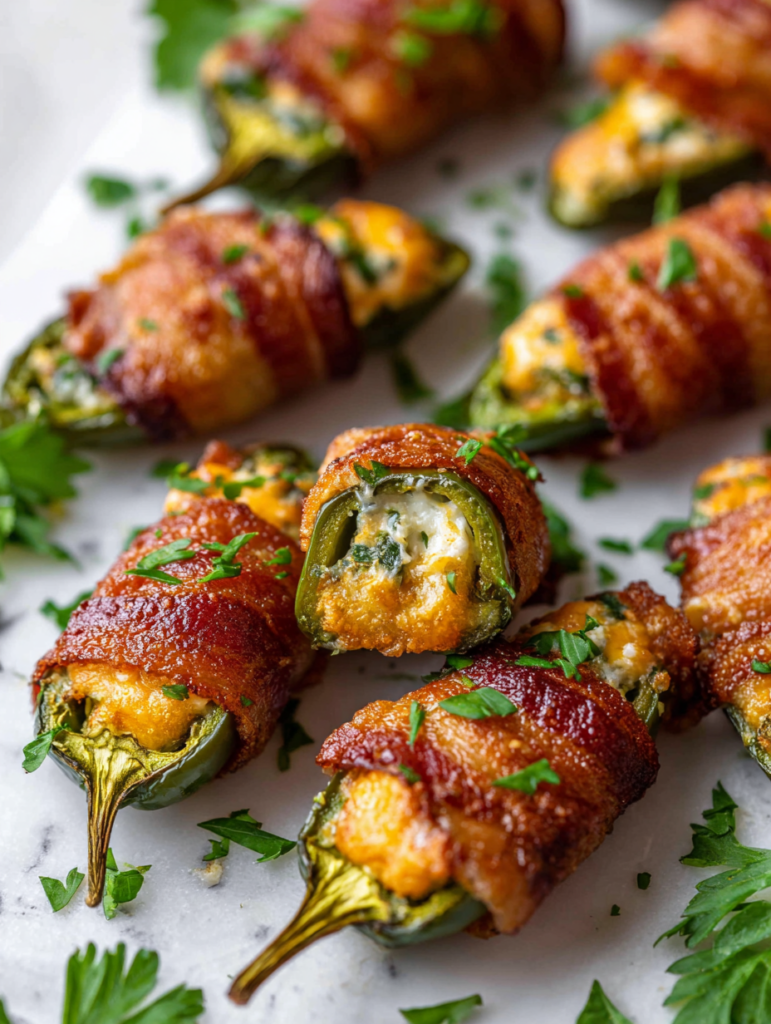 - Serve hot, enjoying the smoky, crispy bacon with the spicy, tender peppers and rich cheese filling. The crackling bacon edges and bubbling cheese make each bite satisfying.