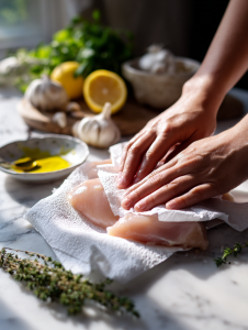 Step 2: Pat the chicken breasts dry with paper towels. Dry skin helps crispiness.