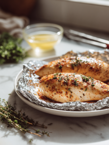 - Once baked, remove the chicken from the oven and tent loosely with foil. Let it rest for 5 minutes to retain juices.