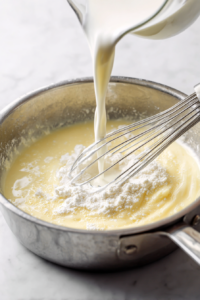 - Gradually pour in the milk, whisking constantly to prevent lumps, and cook until the sauce thickens enough to coat the back of a spoon, about 3-5 minutes.