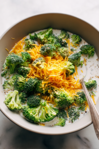 - In a large mixing bowl, combine the drained broccoli, grated cheese, and condensed mushroom soup.