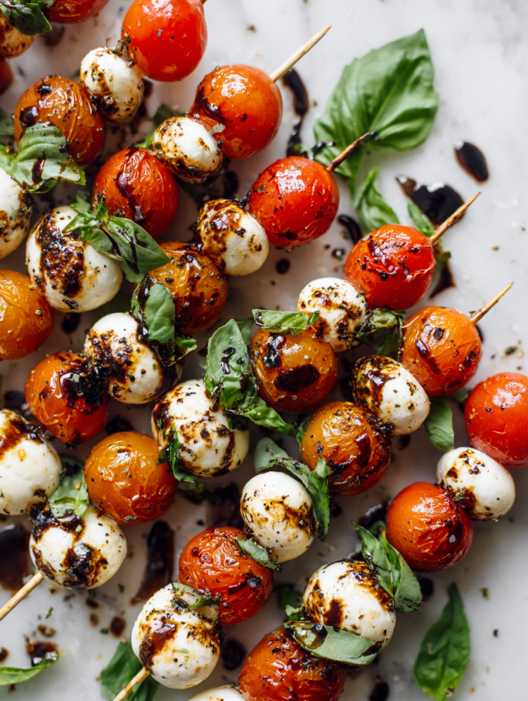 Step 4: Grill or broil the skewers for 2-3 minutes, until the cheese starts to soften and basil leaves char slightly.
