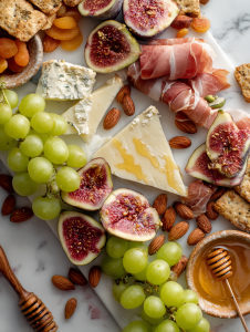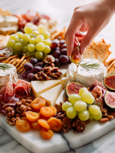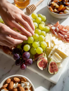- Tuck clusters of grapes and halved figs into gaps around the cheeses and meats, adding pops of color and freshness.