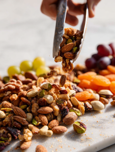 Step 4: Intersperse with colorful fruits—figs, grapes, dried apricots—for visual pop.