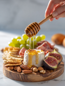 - Drizzle honey over the cheese and fruits in uneven lines for a casual, inviting look.