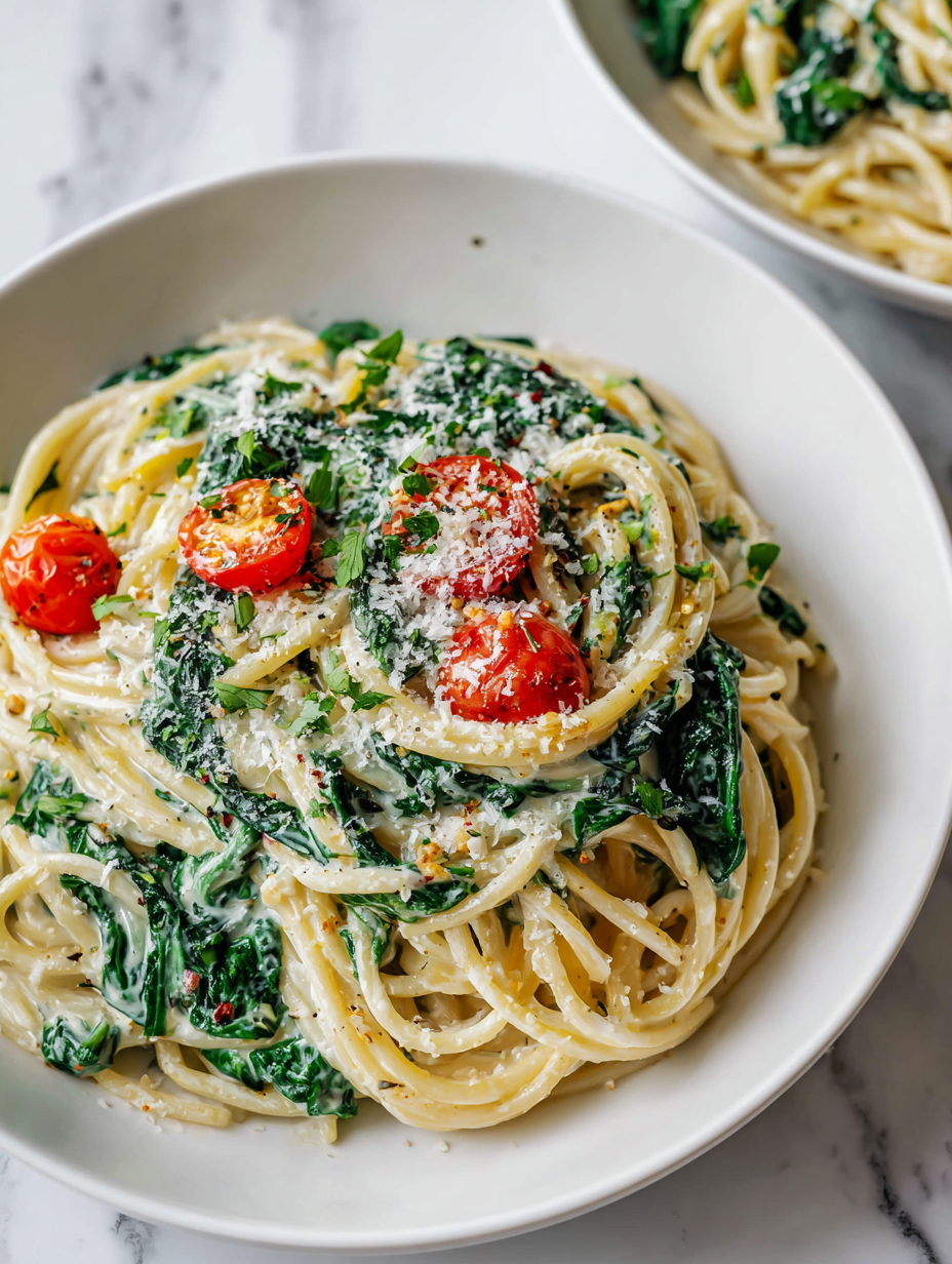 - Serve the creamy spinach pasta hot, garnished with extra Parmesan if desired. Enjoy the bright, velvety, and satisfying flavors in every bite.