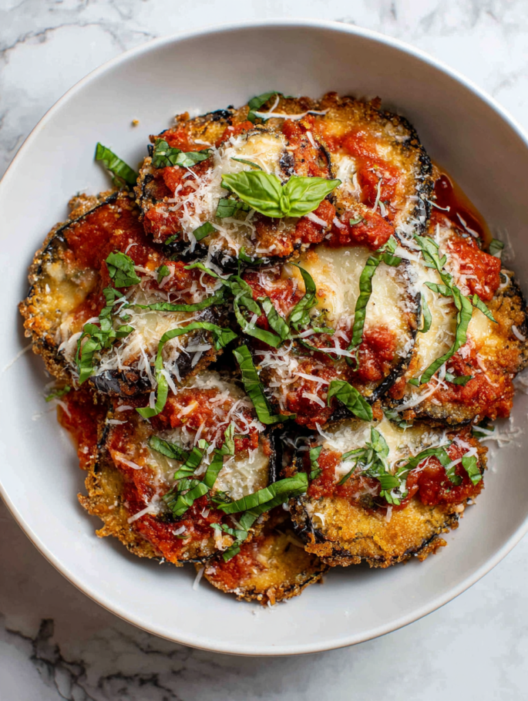 Focusing on the nostalgic comfort of eggplant Parmesan with a modern twist that emphasizes crispy textures and fresh, vibrant flavors, making it feel both timeless and fresh.