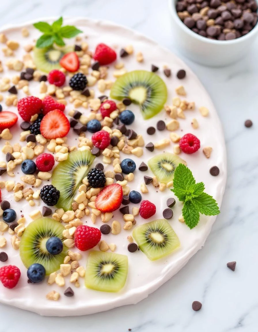 - Once the yogurt is firm but still slightly soft to the touch, drizzle honey or maple syrup evenly over the surface, then gently spread toppings like berries, chopped nuts, chocolate chips, coconut flakes, and a pinch of sea salt across the yogurt layer.