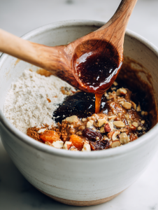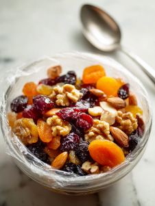 - Mix the dried fruits, chopped nuts, and a splash of dark rum in a bowl. Cover and let soak overnight to plump up the fruits and infuse flavor.