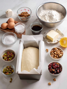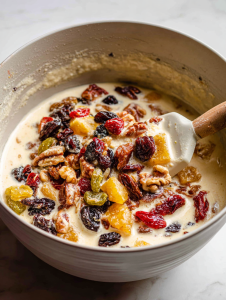 Step 2: Mix the dried fruits, chopped nuts, and a splash of dark rum in a bowl. Let them soak while you prepare the batter.