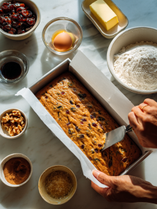 - Pour the batter into your prepared loaf pan, smoothing the top with a spatula to ensure even baking.