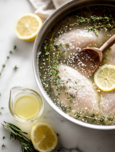 - Combine salt, sugar, and lemon juice in a large bowl with water to create a brine. Submerge the chicken breasts and refrigerate for at least 30 minutes, allowing the meat to tenderize and stay moist.