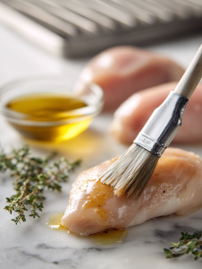 - Brush the chicken breasts with a little olive oil or use a basting brush to coat them evenly. Place the breasts on the hot grill, smooth side down, and listen for a satisfying sizzle.