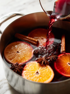 - Pour the red wine into the pot and add the orange slices, cinnamon sticks, cloves, and star anise if using. Add a splash of brandy and honey or sugar for sweetness.