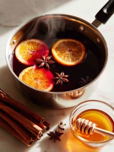 - Gather your ingredients and tools: a sturdy pot, stirring spoon, fine sieve, and mugs. Slice the orange into rounds and have everything ready.