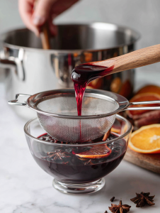 - Remove the pot from heat and strain the mulled wine through a fine sieve into a clean bowl or another pot, catching the spices and citrus slices.