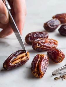 - Using a small knife, carefully slit each date lengthwise to create an opening, then gently remove the pit if present.