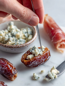 - Stuff each date with a small piece of blue cheese or goat cheese, pressing gently to fill the cavity fully.