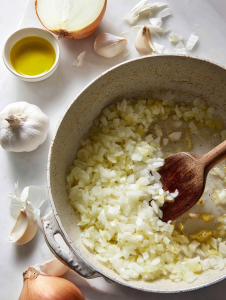 - Add the diced onion and minced garlic to the same pot, stirring with the wooden spoon. Cook for 2-3 minutes until fragrant and the onion becomes translucent, with some bits sticking to the bottom for flavor.
