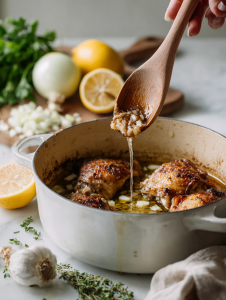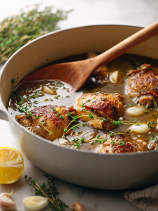 - Return the browned chicken thighs to the pot, along with chopped thyme. Cover and let simmer gently for 20-25 minutes until the chicken is cooked through and tender.