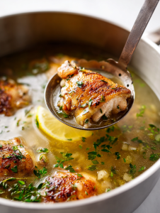 - Remove the chicken thighs from the broth and set aside to rest for a few minutes. Meanwhile, season the broth with salt and pepper to taste, and add the lemon zest or juice for a bright, fresh flavor.