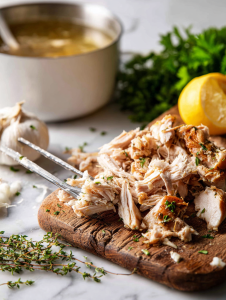 - Shred the chicken thighs into bite-sized pieces with two forks, discarding any excess fat or bones. Return the shredded chicken to the broth, stirring to combine.