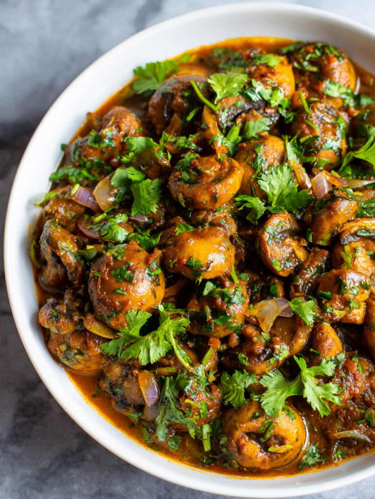 - Rest and plate: let the mushroom masala sit for 2 minutes off heat to meld flavors. Serve hot with rice, naan, or your preferred bread, garnished with chopped cilantro if desired.
