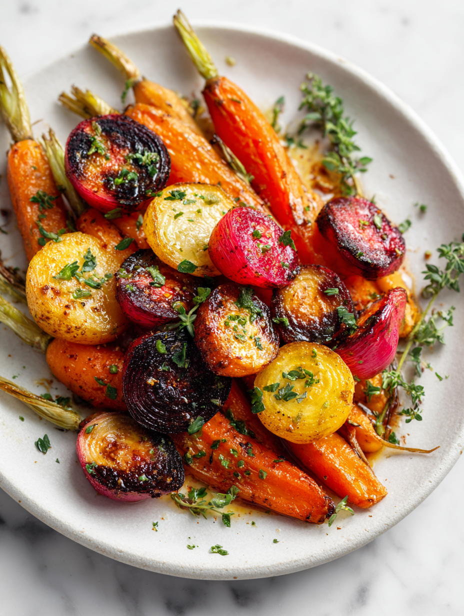 - Root Variants: Turnips or parsnips can replace radishes and carrots. They’ll bring a slightly earthier, starchy note—adjust roasting time accordingly.