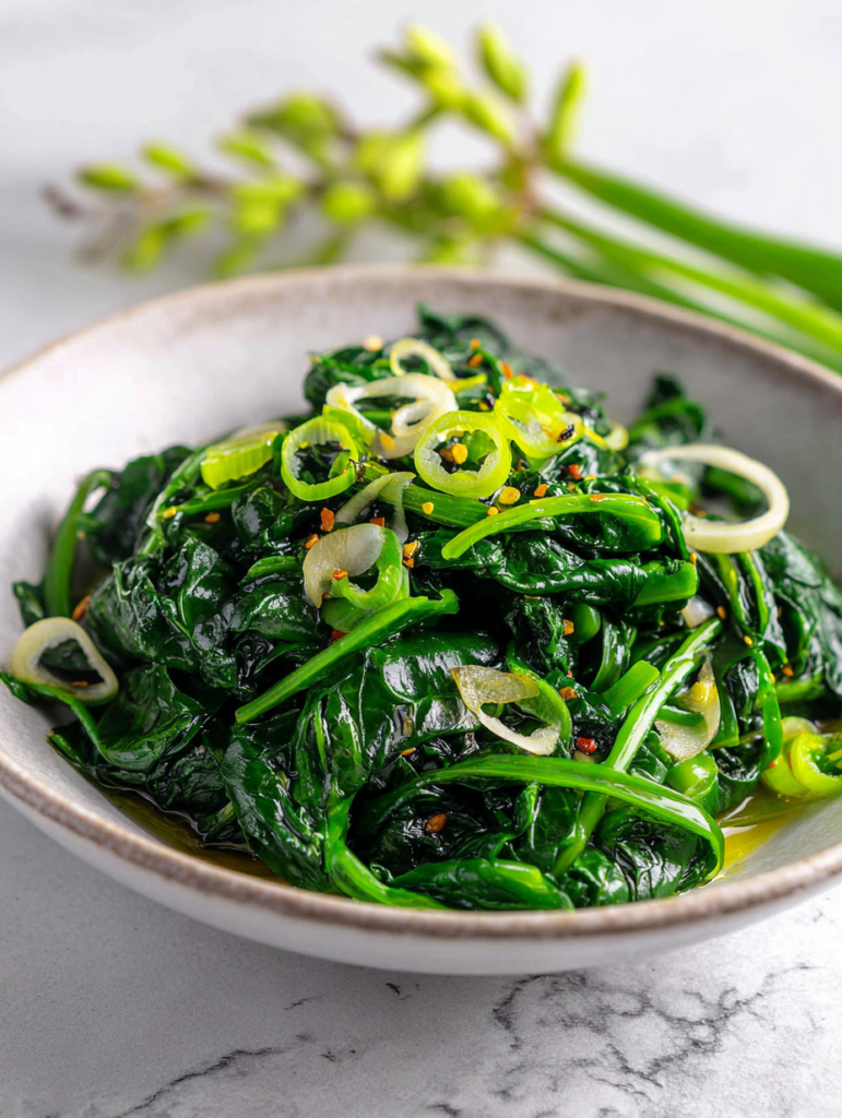 - Remove from heat. Let it rest for a minute to allow residual steam to soften the greens further. Plate immediately, garnishing with optional sesame seeds or chili flakes.