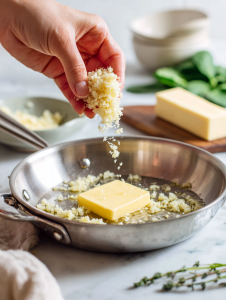 - Add the minced garlic to the skillet and cook for about 30 seconds until it turns golden and releases a savory aroma.