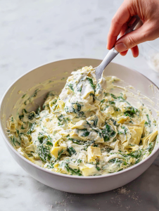 - Mix in the chopped artichoke hearts, then add the softened cream cheese, sour cream, and grated Parmesan. Stir gently until the mixture is smooth and heated through, about 3-4 minutes.