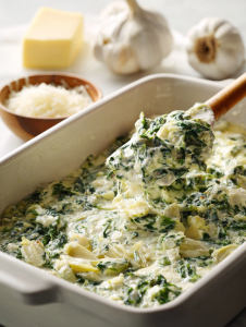 - Transfer the thickened spinach and artichoke mixture into a baking dish, spreading it out evenly.