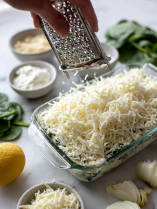 - Sprinkle the shredded mozzarella evenly over the top of the dip, creating a generous layer.