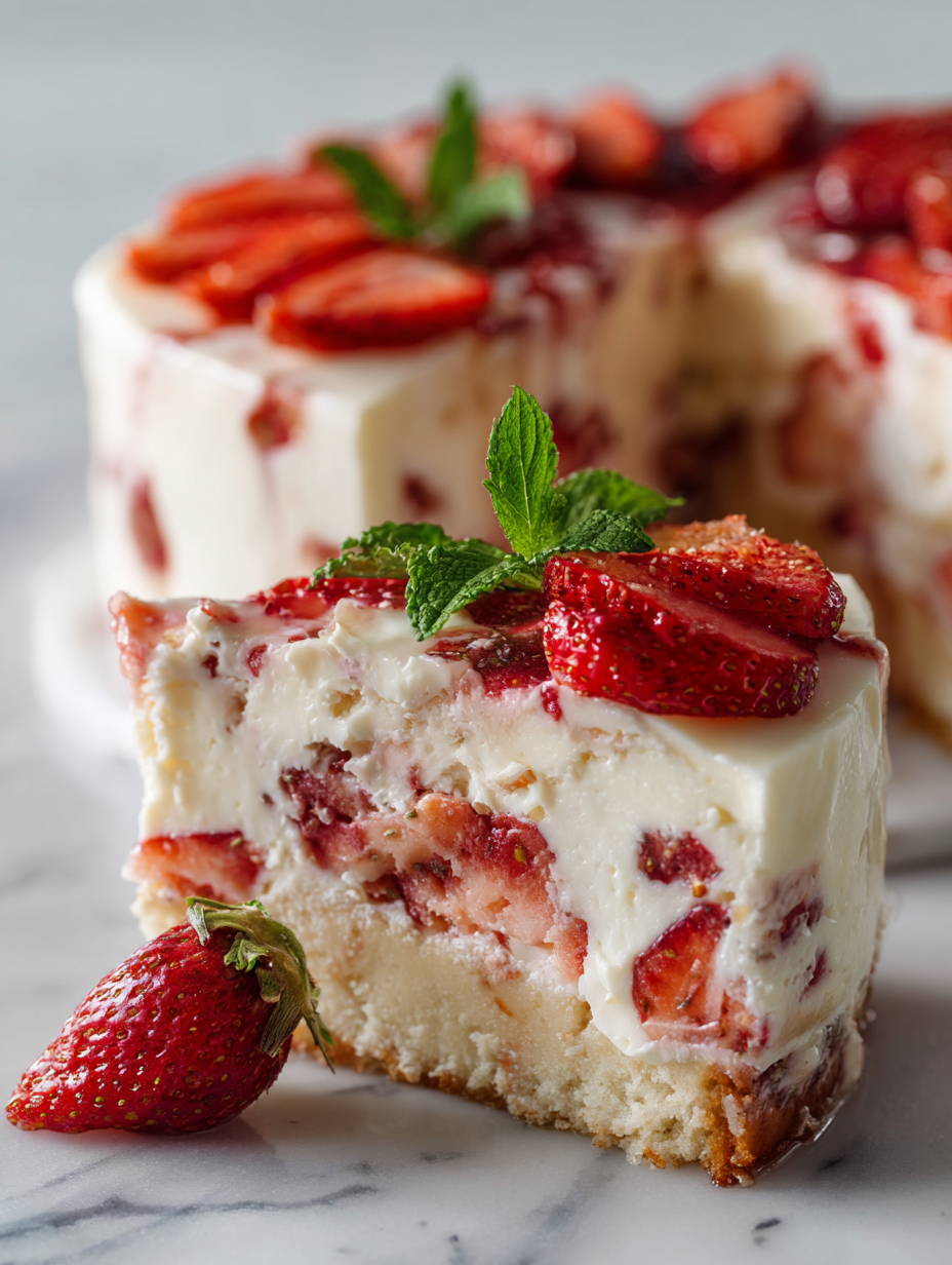 - Finish and serve: Just before serving, arrange the reserved strawberry slices on top for a fresh look. Optionally, dust with powdered sugar or drizzle with a simple glaze. Cut with a warm, sharp knife for clean slices. Serve chilled.