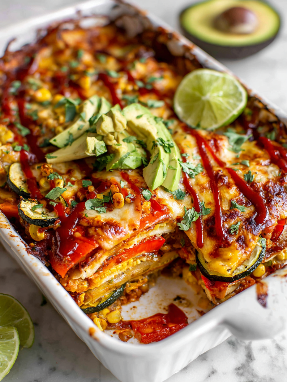 - Slice into squares and serve hot, garnished with herbs or a squeeze of lime if desired. Enjoy this cozy, veggie-loaded enchilada casserole!