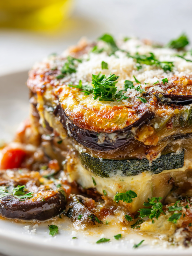 - Garnish with fresh herbs like parsley if desired, then serve warm. Enjoy the rich layers of smoky vegetables topped with creamy béchamel and a crispy crust for a comforting, veggie-packed meal.