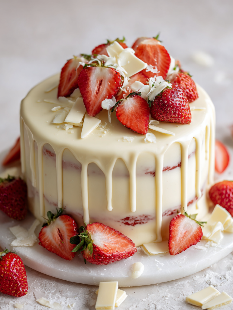Focusing on how the creamy, sweet white chocolate complements the bright, tangy strawberries, this cake balances elegance with a touch of childhood nostalgia, making it perfect for celebratory moments or lazy weekends.